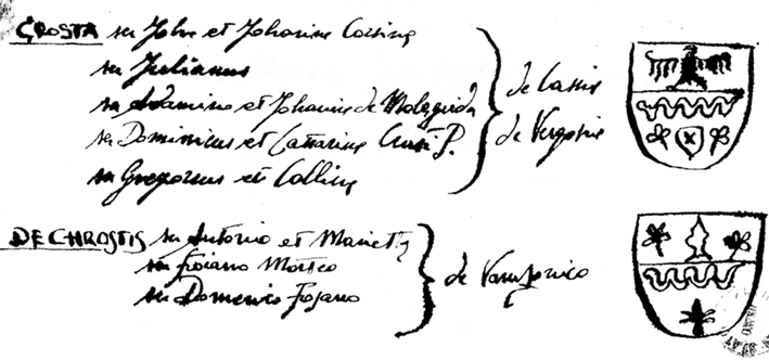 Sempre all 'archivio di Stato, nelle cartelle famiglie, vi è un disegno dello stemma redatto da un architetto nel 1768 e firmato da un notaio, e documenti in cui si fa riferimento ai Crosta indicandoli con titolo nobiliare.